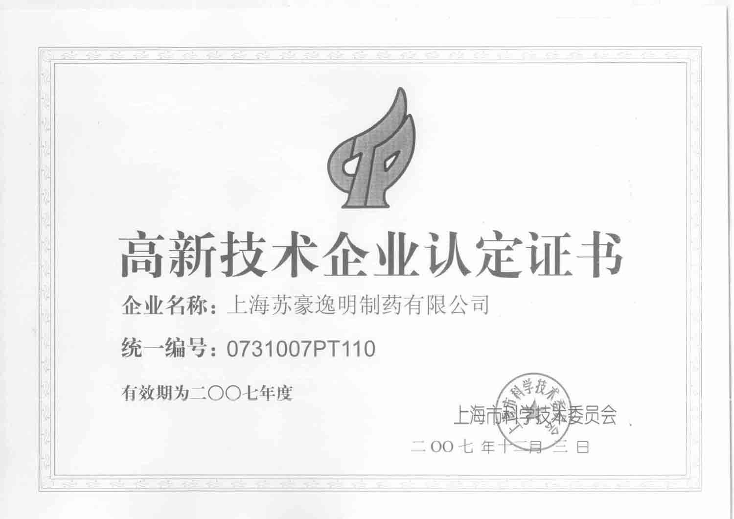 經上海市高新技術企業認定領導小組批準,我司被認定為2007年度第一批“上海市高新技術企業”